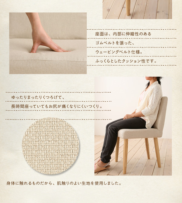 ゆったりまったりくつろげて、長時間座っていてもお尻が痛くなりにくいつくり。身体に触れるものだから、肌触りのよい生地を使用しました。