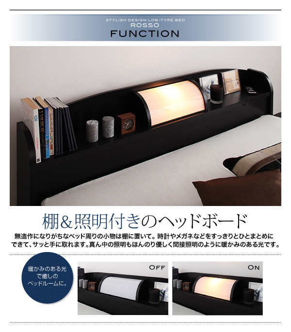• 照明・棚付きフロアベッド【ROSSO】ロッソ【ボンネルコイルマットレス付き:ロングサイズ】