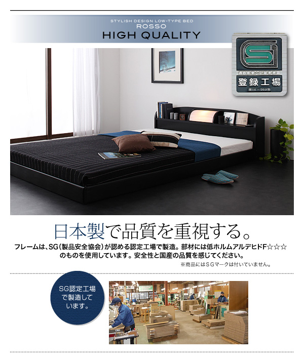 フレームは、SG(製品安全協会)が認める認定工場で製造。低ホルムアルデヒドF☆☆☆の部材を使用しています。安全性と国産の品質を感じてください。※商品にはSGマークは付いていません。
