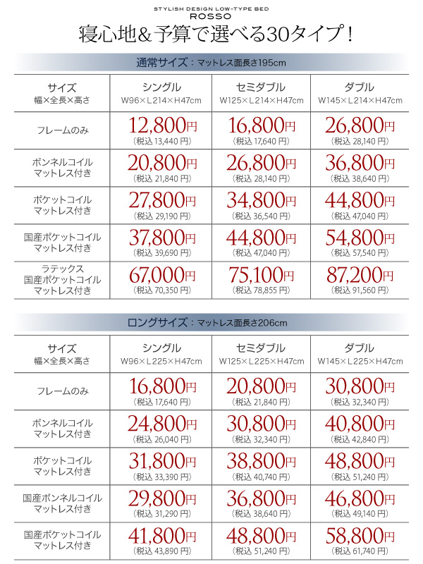 シングル:29800円(税込31290)、セミダブル:36800円(税込38640)、ダブル:46800円(税込49140)