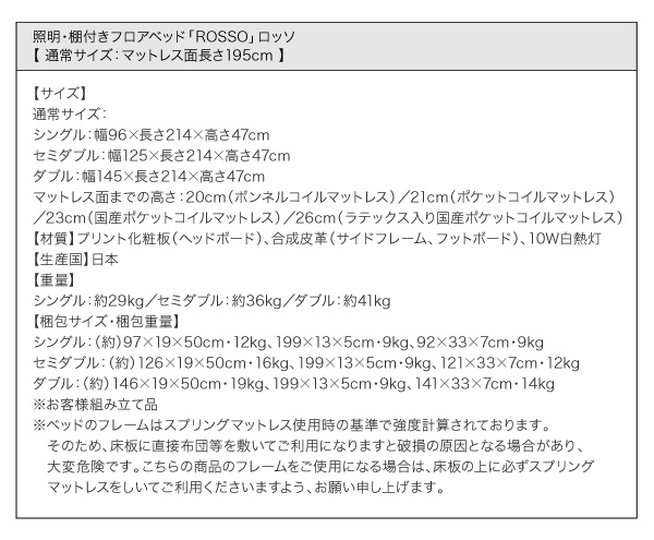 照明・棚付きフロアベッド【ROSSO】ロッソ【ボンネルコイルマットレス付き:ロングサイズ】