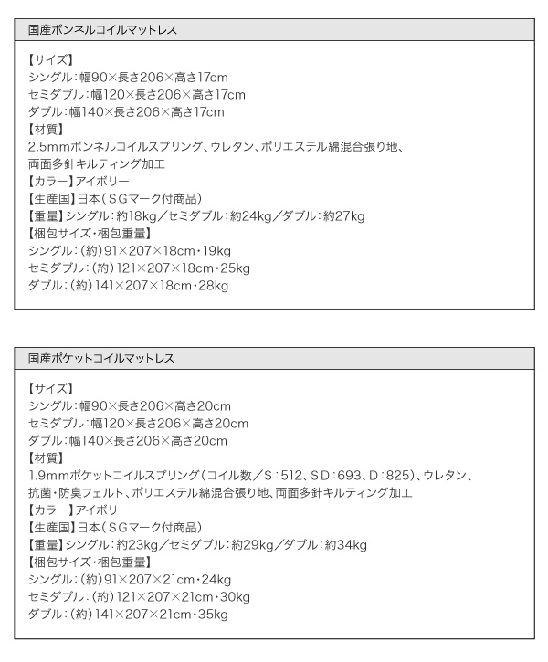 マットレス面までの高さ:20cm(ボンネルコイルマットレス)、21cm(ポケットコイルマットレス)、23cm(国産ポケットコイルマットレス)、26cm(ラテックス入り国産ポケットコイルマットレス)