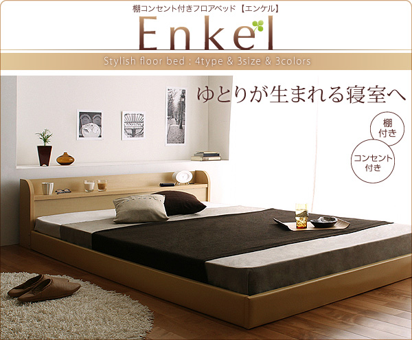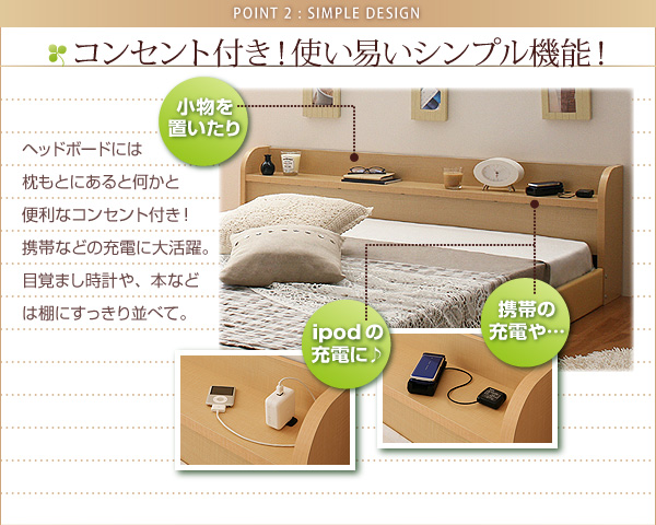 ヘッドボードには枕もとにあると何かと便利なコンセント付き!携帯などの充電に大活躍。目覚まし時計や、本などは棚にすっきり並べて。