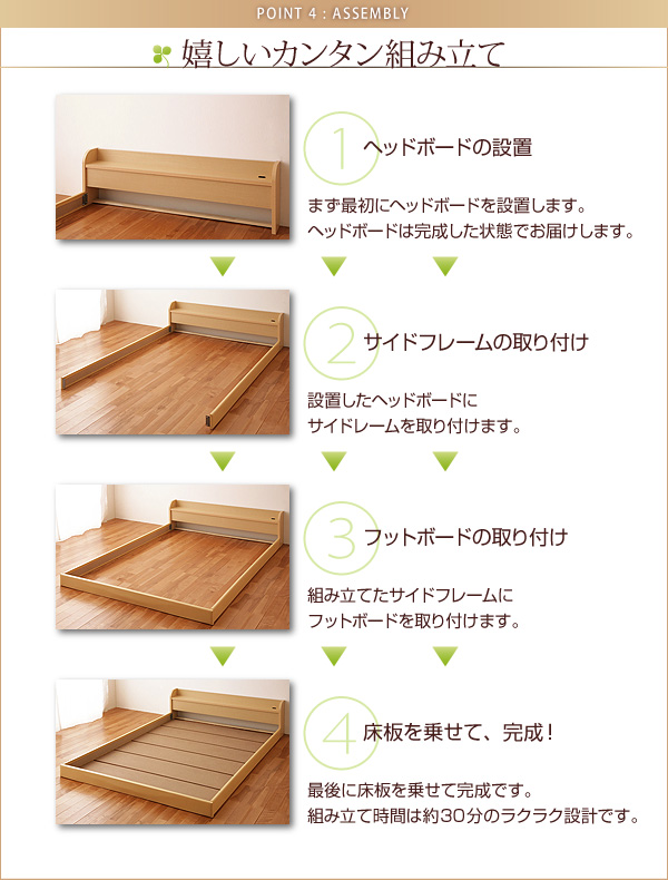 注意※ベッドのフレームはスプリングマットレス使用時の基準で強度計算されております。そのため、床板に直接布団等を敷いてご利用になりますと破損の原因となる場合があり、大変危険です。こちらの商品のフレームをご使用になる場合は、床板の上に必ずスプリングマットレスをしいてご利用くださいますよう、お願い申し上げます。