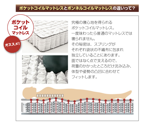 究極の寝心地を得られるポケットコイルマットレス。一度味わったら普通のマットレスはでは寝られません。その秘密は、スプリングがそれぞれ袋状の不織布に包まれ独立しているので、荷重のかかった場所だけが沈み込む構造だから。面ではなく点で支えるので、荷重のかかったところだけ沈み込み、体型や姿勢の凸凹に合わせてフィットします。