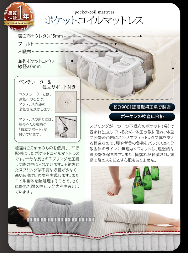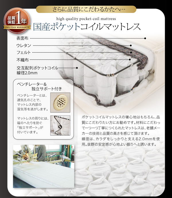 日本製ポケットコイルマットレスをご用意【1年間保証】