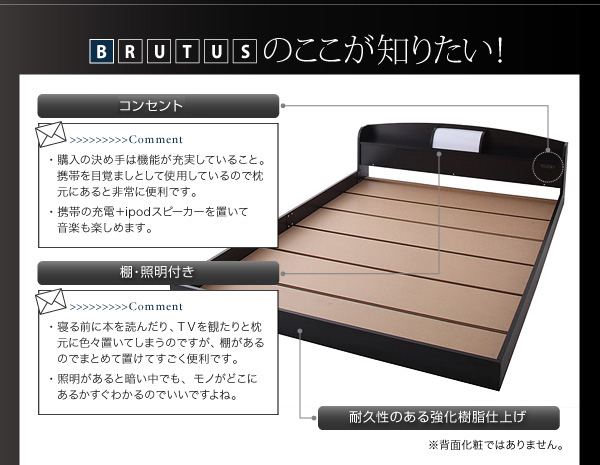 温かな灯りの照明、携帯の充電には欠かせないコンセント、CDや本が置ける棚・・・。便利がすぐ手に届くヘッドボードです。