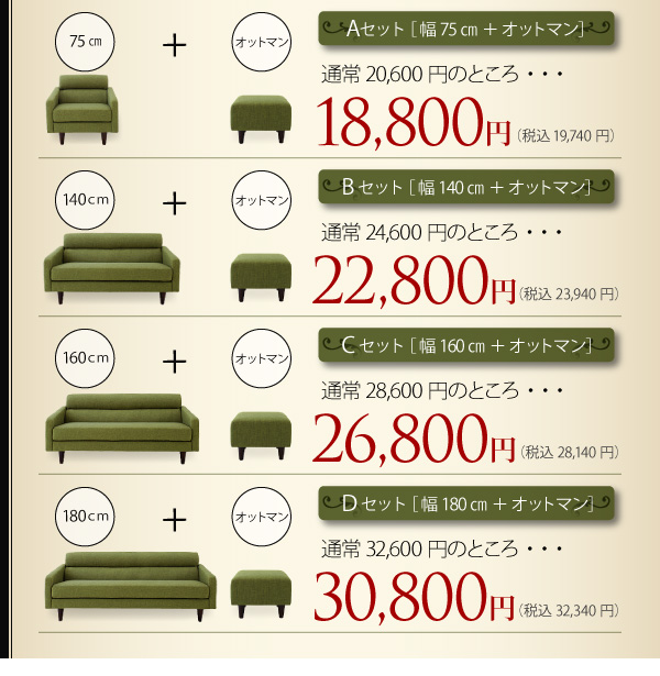 スタンダードソファ【OLIVEA】オリヴィア Aセット(幅75+オットマン)