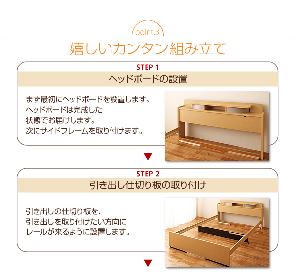 まず最初にヘッドボードを設置します。ヘッドボードは完成した上でお届けします。次にサイドフレームを取り付けます。