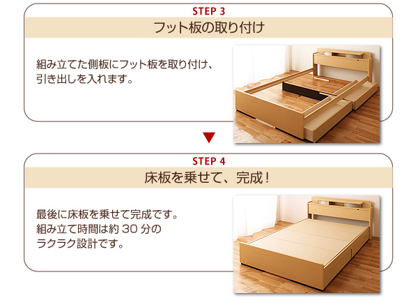 組み立てたサイドフレームにフット板を取り付け、引き出しを入れます。