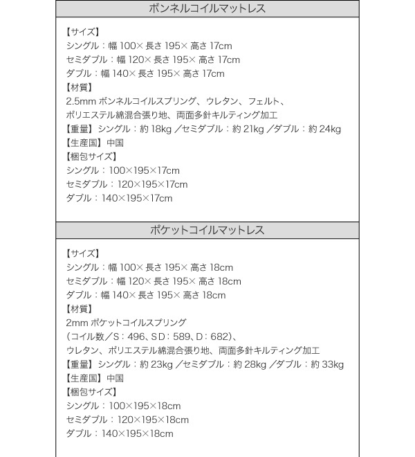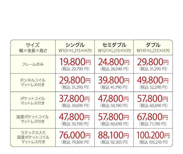 シングル:47800円(税込50190)、セミダブル:57800円(税込60690)、ダブル:67800円(税込71190)