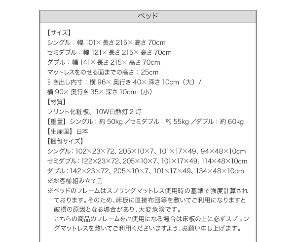 注意※ベッドのフレームはスプリングマットレス使用時の基準で強度計算されております。そのため、床板に直接布団等を敷いてご利用になりますと破損の原因となる場合があり、大変危険です。こちらの商品のフレームをご使用になる場合は、床板の上に必ずスプリングマットレスをしいてご利用くださいますよう、お願い申し上げます。