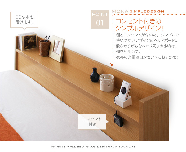 小物を置ける棚と、コンセント付きのヘッドボード。シンプルなデザインでお部屋をすっきりと。