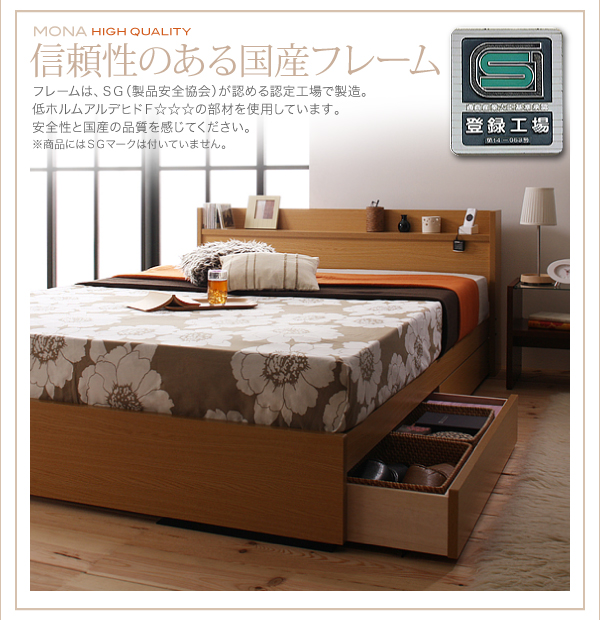フレームは、SG(製品安全協会)が認める認定工場で製造。低ホルムアルデヒドF☆☆☆の部材を使用しています。安全性と国産の品質を感じてください。※商品にはSGマークは付いていません。