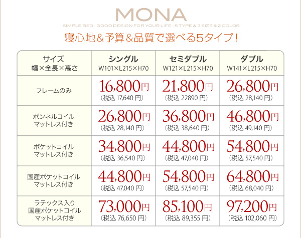 シングル:44800円(税込47040)、セミダブル:54800円(税込57540)、ダブル:64800円(税込68040)