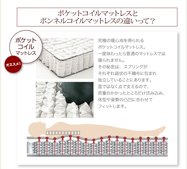 究極の寝心地を得られるポケットコイルマットレス。一度味わったら普通のマットレスはでは寝られません。その秘密は、スプリングがそれぞれ袋状の不織布に包まれ独立しているので、荷重のかかった場所だけが沈み込む構造だから。面ではなく点で支えるので、荷重のかかったところだけ沈み込み、体型や姿勢の凸凹に合わせてフィットします。
