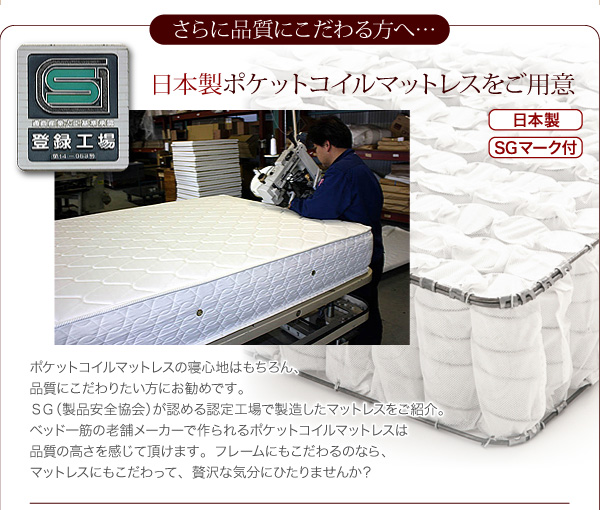 ポケットコイルマットレスの寝心地はもちろん、品質にこだわりたい方にお勧めです。SG(製品安全協会)が認める認定工場で製造したマットレスをご紹介。ベッド一筋の老舗メーカーで作らるポケットコイルマットレスは品質の高さを感じて頂けます。フレームにもこだわるのなら、マットレスにもこだわって、贅沢な気分にひたりませんか?
