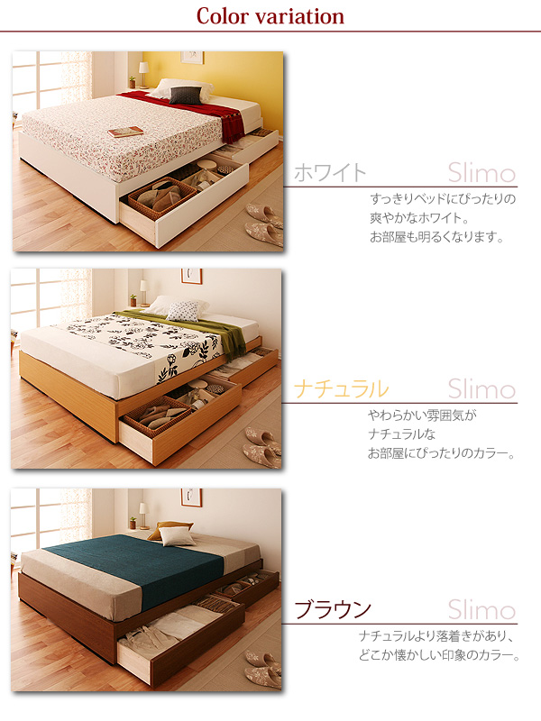 ヘッドボードがないすっきりとしたデザインが特徴!お部屋の半分をしめるベッドはできるだけシンプルがいいですよね。狭いお部屋でもベッドを置きたい人にもぴったりのSlimoです。