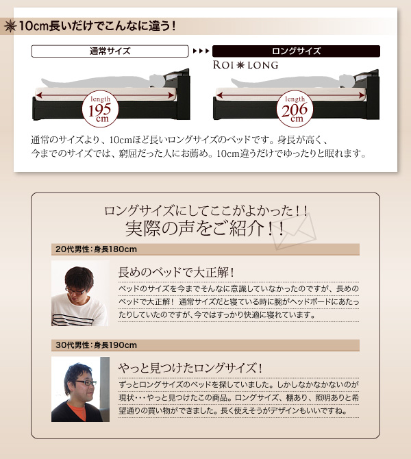 30代男性:身長190cm/ずっとロングサイズのベッドを探していました。しかしなかなかないのが現状・・・やっと見つけたこの商品。ロングサイズ、棚あり、照明ありと希望通りの買い物ができました。長く使えそうがデザインもいいですね。