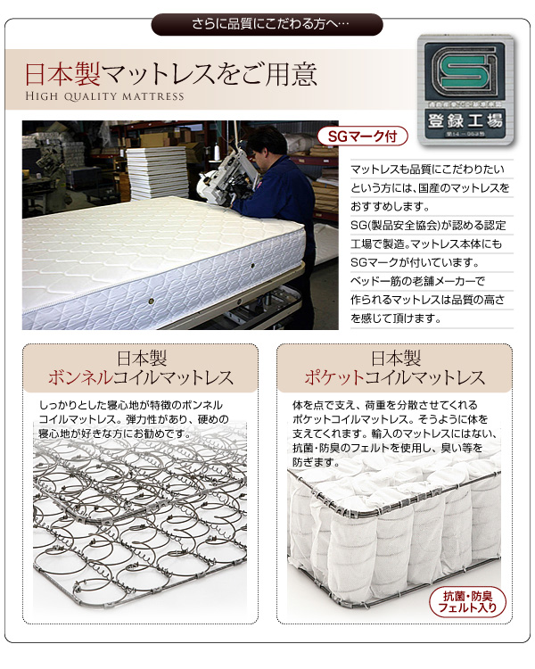 マットレスも品質にこだわりたい方にお勧めです。SG(製品安全協会)が認める認定工場で製造。マットレス本体にもSGマークが付いています。ベッド一筋の老舗メーカーで作られるマットレスは品質の高さを感じて頂けます。