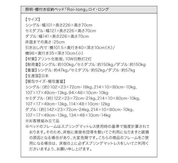 棚・照明付き収納ベッド【Roi-long】ロイ・ロング【ポケットコイルマットレス付き】