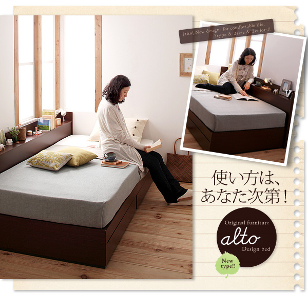 altoは、棚をサイドに取り付けたまったく新しいデザイン!通常のベッドは頭側に宮が付いていますが、サイドに取り付けることで、空間にすっきりと納まり、見た目も綺麗。しかもワイドになった棚がさらに機能性をUP。今までなかった新しいカタチで、ベッドルームをもっと快適なものにしませんか?