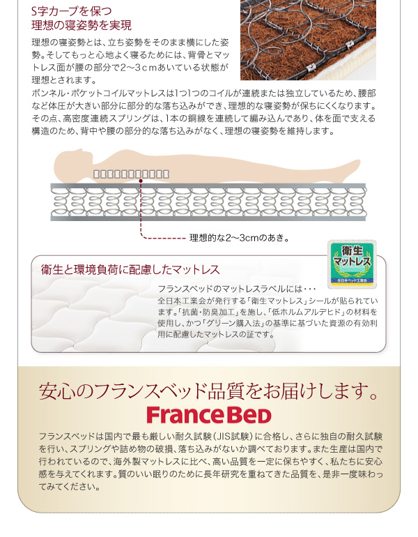 フランスベッド独自の高性能スプリングで、部分的な落ち込みがなく、理想的な寝姿勢を維持します。