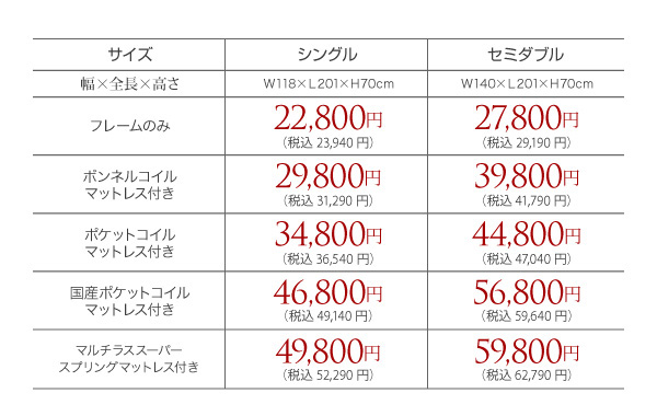 シングル:49800円(税込52290)、セミダブル:59800円(税込62790)