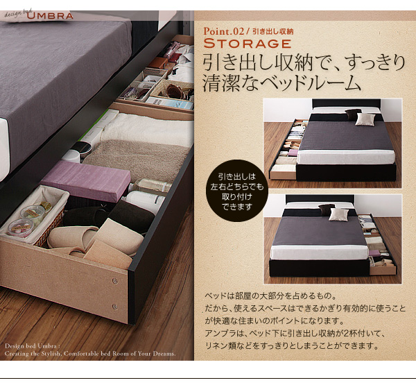 ベッド下は2杯の引き出し付き。左右どちらでも付けられます。