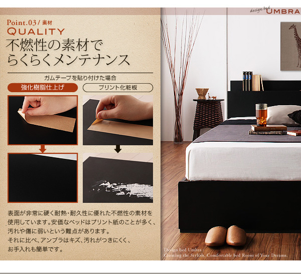 表面が非常に硬く耐熱・耐久性に優れた不燃性の素材を使用しています。安価なベッドはプリント紙のことが多く、汚れや傷に弱いという難点があります。それに比べ、アンブラはキズ、汚れがつきにくく、お手入れも簡単です。