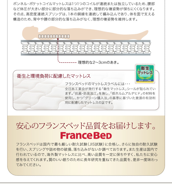フランスベッド独自の高性能スプリングで、部分的な落ち込みがなく、理想的な寝姿勢を維持します。