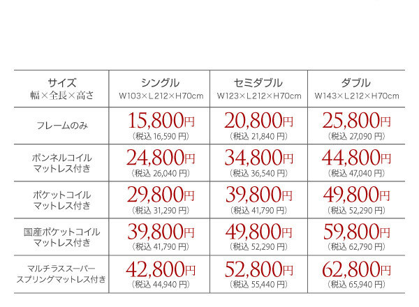 シングル:39800円(税込41790)、セミダブル:49800円(税込52290)、ダブル:59800円(税込62790)