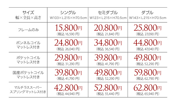 シングル:39800円(税込41790)、セミダブル:49800円(税込52290)、ダブル:59800円(税込62790)