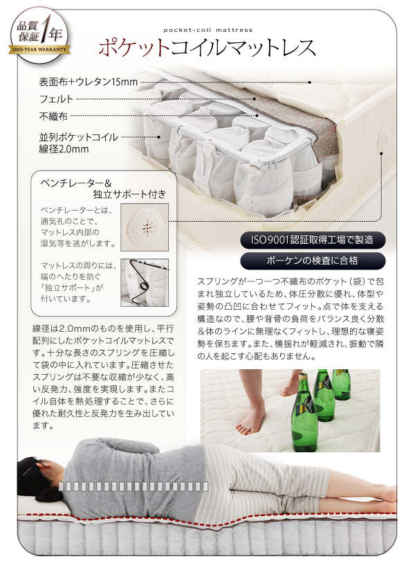 日本製ポケットコイルマットレスをご用意【1年間保証】