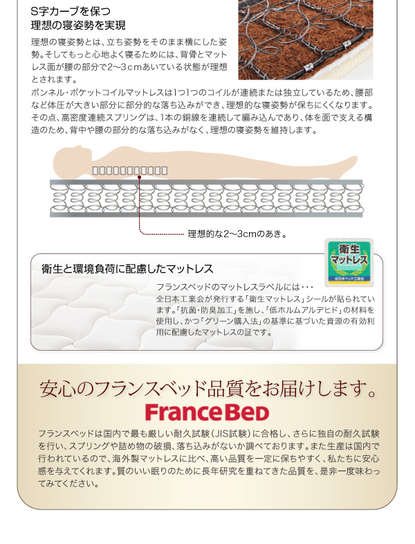フランスベッド独自の高性能スプリングで、部分的な落ち込みがなく、理想的な寝姿勢を維持します。