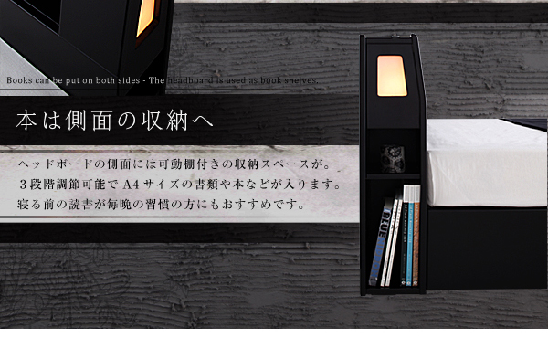 ヘッドボードの側面には可動棚付きの収納スペースが。3段階調節可能でA4サイズの書類や
