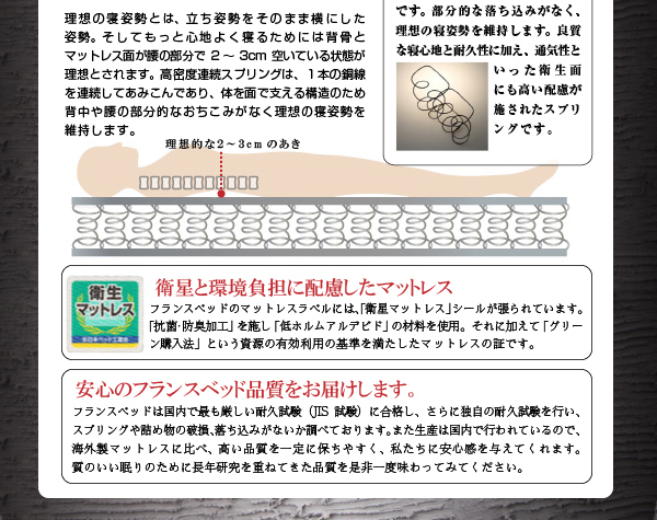 世界中から支持されているフランスベッドの高密度スプリングを使用した、マルチラススーパースプリングマットレス。