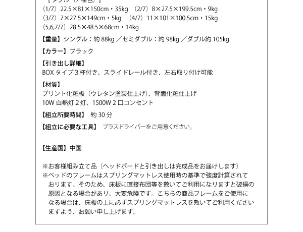 ※ベッドのフレームはスプリングマットレス使用時の基準で強度計算されております。そのため、床板に直接布団等を敷いてご利用になりますと破損の原因となる場合があり、大変危険です。こちらの商品フレームをご使用になる場合は、床板の上に必ずスプリングマットレスを敷いてご利用くださいますよう、お願い申し上げます。