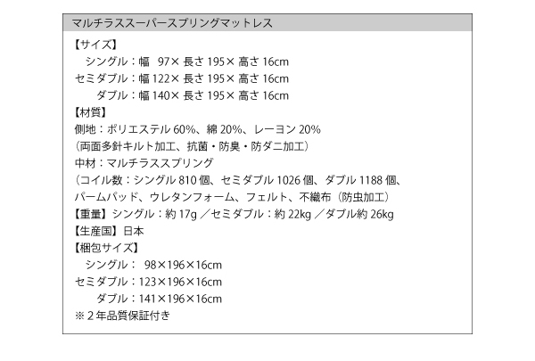 2.2mmボンネルコイルスプリング、(コイル数:S288個、SD352個、D416個)ウレタンフォーム、ポリエステル100%張り地、両面多針キルティング加工