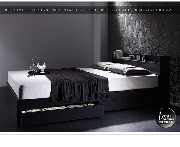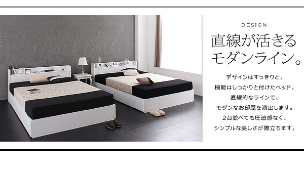 デザインはすっきりと、機能はしっかりと付けたベッド。直線的なラインで、モダンなお部屋を演出します。2題並べても圧迫感なく、シンプルな美しさが際立ちます。