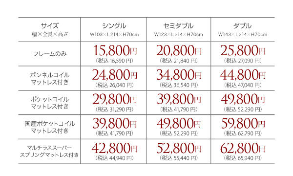 シングル:39800円(税込41790)、セミダブル:49800円(税込52290)、ダブル:59800円(税込62790)