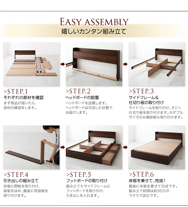 サイドフレームを取り付け、そこへ引き出しの仕切り板を取り付けます。※ダブルサイズのみ補強板も取り付けます。