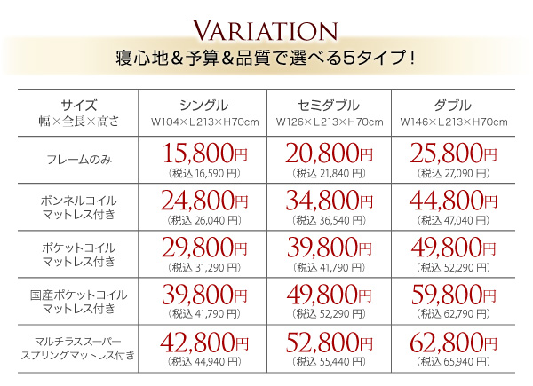 シングル:39800円(税込41790)、セミダブル:49800円(税込52290)、ダブル:59800円(税込62790)