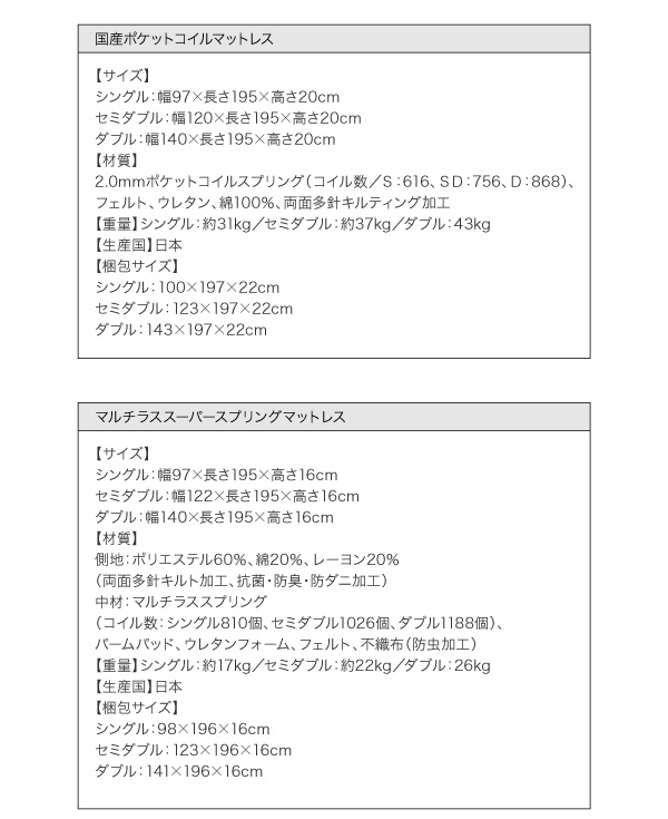 中材:マルチラススプリング(コイル数:シングル810個、セミダブル1026個、ダブル1188個)、パームパッド、ウレタンフォーム、フェルト、不織布(防虫加工)