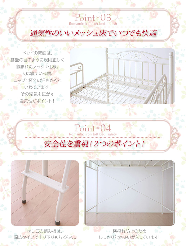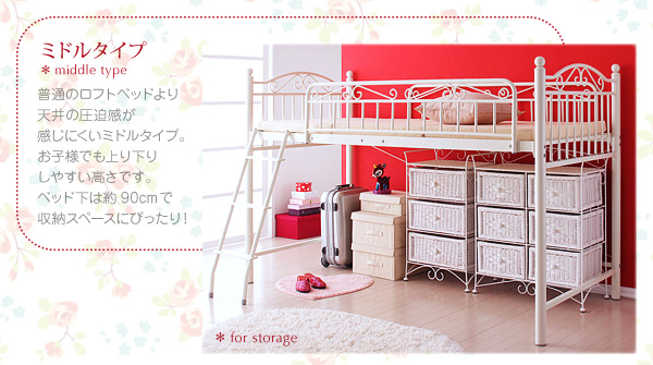 かわいいロフトベッドが欲しい!!そんなあなたにぴったりの姫系デザインのロフトベッド♪アイアンを使ったエレガントなデザインで、空間を可憐な雰囲気で満たします。お友達にも自慢できるかわいらしさ。