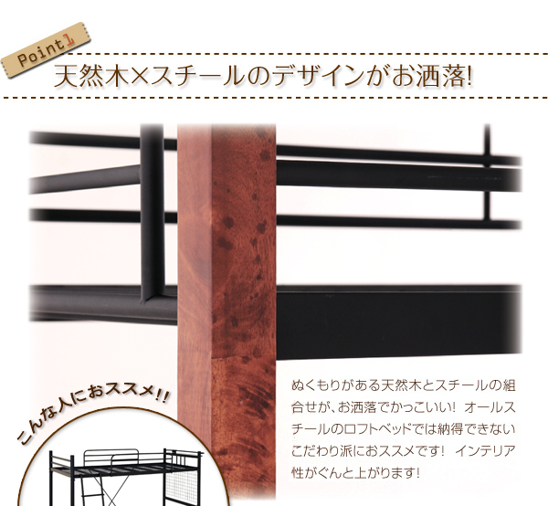 ぬくもりがある天然木とスチールの組合せが、お洒落でかっこいい!オールスチールのロフトベッドでは納得できないこだわり派でおススメです!インテリア性がぐんと上がります!