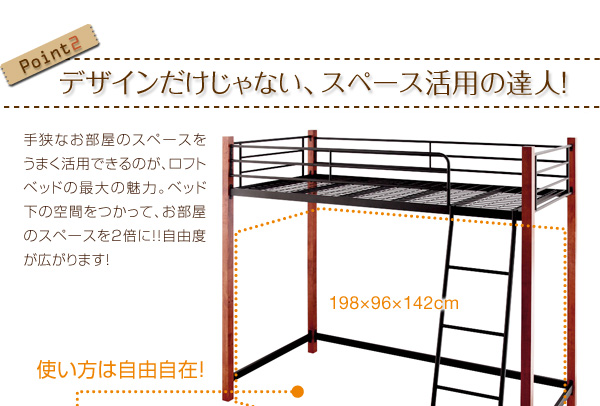 手狭なお部屋のスペースをうまく活用できるのが、ロフトベッドの最大の魅力。ベッド下の空間をつかって、お部屋のスペースを2倍に!!自由度が広がります!