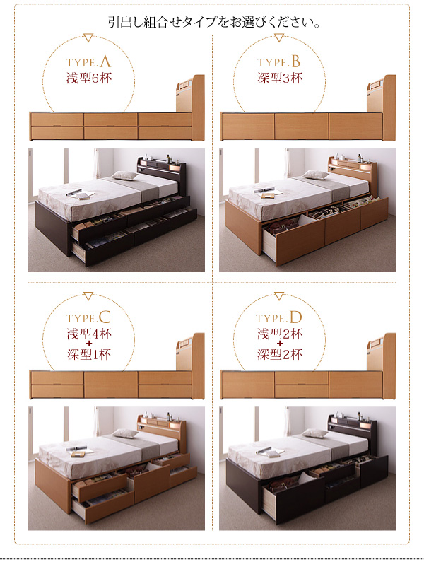 ベッドに大容量収納スペースをプラス!浅型引き出し&深型引き出し&長物収納付きで、ベッド下が全て収納スペース。お部屋の空間を最大限に生かす収納に優れたベッドです。