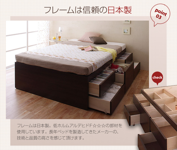 フレームは日本製。低ホルムアルデヒドF☆☆☆の部材を使用しています。長年ベッドを製造してきたメーカーの、技術と品質の高さを感じて頂けます。