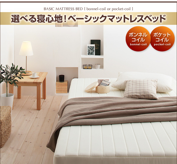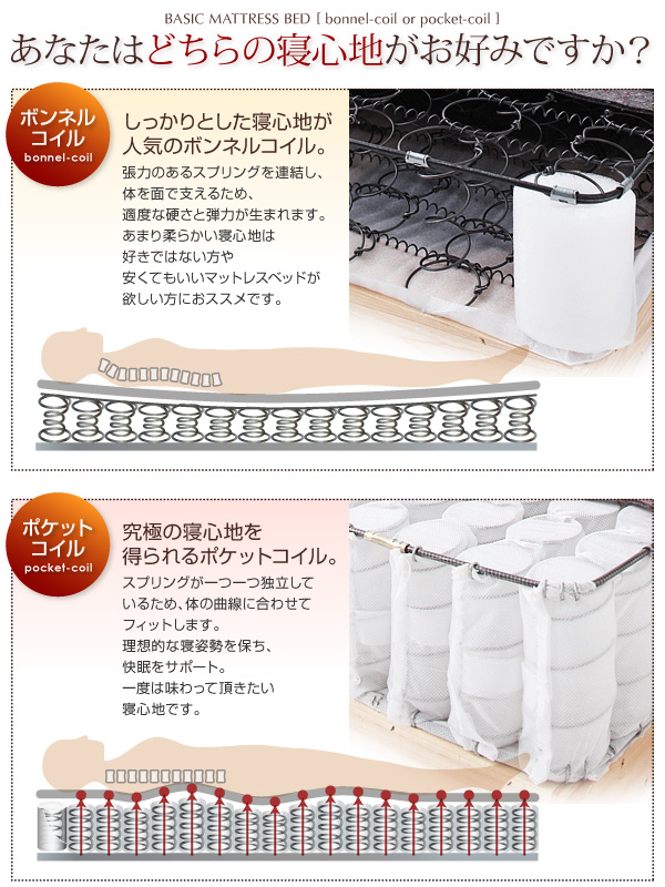 ボンネルコイルとは、スプリング状のコイルをそのままマットレスの全面に配置し、連結したものです。ポケットコイルと違い、点ではなく、面で支えるため、適度に硬く、弾力性に優れています。ベッドで寝ているというより、畳の上に布団を敷いて寝ているような感覚でしっかりとした寝心地が特徴です。